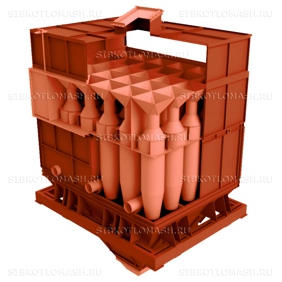 Циклон БЦ-512-4-(12х8) состоит из секции 96 циклонных элементов, перекрытий, панелей, бункера с рамой, фланцев. Диаметр циклонных элементов БЦ-512-4-(12х8) составляет 512 мм и обеспечивает его надежную работу при улавливании слипающихся зол, а также при работе котлов на многозольных топливах.